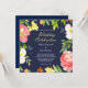 Das blumengeschmückte Hochzeitsthema erhält mit dieser kühnen und hellen Einladung ein modernes und modernes Aussehen. Auf einem dramatischen marineblau blauen Hintergrund ist ein prächtiger Blumenrand zu sehen. Die Farbtöne sind in Rosa, Gelb, Weiß, Mandarine orange und grün gehalten. Ihr eigener Text ist in der Mitte weiß, mit der Typografie "Hochzeitsfeier" in Gold. Die Rückseite der Einladung ist massiv passend marineblau blau. Schauen Sie sich die passenden Hochzeitsprodukte in unserem Shop an.