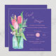 Romantischer Tulip Square Wedding Einladung - kühne Lila Background & Mason Jar Blume. Die romantische und moderne Hochzeitseinladung mit einem handbemalten Tulpenbouquet in einem Maurerkrug auf kühlem, lila Hintergrund lädt zum Verweilen ein. Die Vornamen des Ehepaares in "blush script" fügen eine weiche persönliche Touch hinzu, während das übersichtliche Layout die Einzelheiten der Hochzeit schön behalte. Ein Dattelelement aus dem rötlichen Kreis fügt Stil und Modernität hinzu. Ideal für Hochzeiten im Garten, im Frühling oder bei lila Themen. Vollständig anpassbar mit Ihren Namen, Ort und Zeit. Matching Speichern der verfügbaren Daten. Kontaktieren Sie mich für weitere Anpassungen unter mypaperlove2021@gmail.com