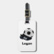 An der Vorderseite des Gepäcks befinden sich ein schwarz-weißer Fußball und Schuhe. Der Name des Fußballspielers ist unten geschrieben. Die Rückseite hat die Kontaktdaten. Es ist schwarz mit einem weißen Schriftart.