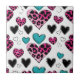 Eine kühne und spielerische nahtlose Herz-Muster-Keramikfliese mit glänzenden schwarzen Herzen, lebendigen rosa Herzen mit trendigen Leoparden-Druck-Akzente und frischen türkisen Herz-Details auf einem sauberen weißen Hintergrund. Dieses moderne liebesbezogene Design verbindet lustigen Tierdruck mit romantischen Elementen und schafft eine auffallende und modische Ästhetik.