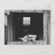 Kuhschädel sitzend auf einem Fenster aus einer alten Scheune, mit Spinnennetzen am Schädel. Gebäude war ein Viehzuchtbetrieb, wird aber nicht mehr verwendet.