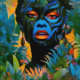 "Kuiráya" - bemaltes Leaf - Frauen in Amazonien. Mit einem intensiven Blick ist sie so auffallend und rätselhaft wie ein Blatt, das mit den Mustern der Natur gekennzeichnet ist, ihre surreal farbenfrohe Körperfarbe, die mit dem Wald verschmilzt und sie zu einem lebendigen Teil der sich ständig verändernden Landschaft des Regenwaldes macht.
