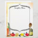 Obst, Gemüse, Olivenöl, Messer und Holzlöffel des Koch auf dieser Speisekarte mit Lorbeer blühte Textbox und verbrannten Hintergrund, ideal für Koch Nacht, Taschen, Party oder Catering-Menü.