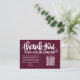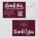 Dankeschön an unseren burgundischen Kunden Danke, dass Sie QR Code Coupon Visitenkarte einfügen. Diese durchdachte Karte verfügt über einen QR-Code, der Ihre Kunden zu einem exklusiven Rabatt oder Sonderangebot führt und die Loyalität der Kunden würdigt. Mit dieser personalisierten und stilvollen Geste können Sie Ihren Kunden einen bleibenden Eindruck vermitteln und die Beziehungen stärken.