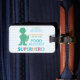 Beschriften Sie Lesung, das tragende Adrenalin, Nahrungsmittelallergie-Superheld. Fertigen Sie mit Namen- und Listenallergenen besonders an oder verlassen Sie freien Raum. Hilfsalarm andere einer Nahrungsmittelallergie. Grüne Superherojungen-Silhouette auf blauem Zickzack Streifenhintergrund mit mehrfarbigem Text. Ändern Sie "Namen" "zum Adrenalininnere" und befestigen Sie zu den Rucksäcken oder zu den medizinischen Taschen, um zu alarmieren, dass ein Adrenalingerät in der Tasche im Notfall ist. Entwürfe durch Lil Allergie befürwortet www.lilallergyadvocates.com
