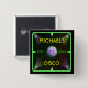 Stellen Sie Ihren eigenen kundenspezifischen Siebzigerjahre Disco-Quadratknopf unter Verwendung dieser Schablone her. Der Knopf hat eine grüne Neongrenze mit vier Scheinwerfern, die auf einen silbrigen Discospiegelball/Glitterball glänzen. Der schwarze Hintergrund hat einen schwachen Regenbogen der bunten Quadrate.
