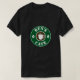 Kundenspezifische barrista T-Shirts für Café- oder Kaffeeliebhaber. Personalisiertes dunkles T-Stück mit Handelsnamen oder lustigem Zitat. Auch verfügbar auf Strickjacken und Kapuzenpullis. Stellen Sie Ausstattungen für Chef, Co-Arbeitskraft, Freunde, Familie, Mamma, Schwester, Angestellten, Co-Arbeitskraft, Personal, kundengerechte Schablone des Geschäftspersonals etc. mit Schale und Kaffeebohnelogo her. Grüne und braune Farben.