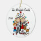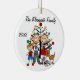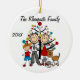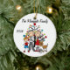 Eine hübsche runde Keramikandenken Weihnachtsfeiertagsverzierung kennzeichnet einen Strichmännchenvati, Mamma, Jungen in der Baseballmütze, eine Katze und den Familienhund vor dem verzierten Weihnachtsbaum und den Bereichen, in denen Sie Text einschließlich das laufende Jahr und den Familiennamen hinzufügen können. Dieses ist ein entzückendes Geschenk, damit jede mögliche Familie das Jahr gedenkt!