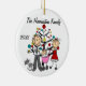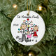 Eine hübsche runde Keramikandenken Weihnachtsfeiertagsverzierung kennzeichnet einen Strichmännchenvati, Mamma, Babymädchen in einem rosa Wagen und Familienkatze vor dem verzierten Weihnachtsbaum und den Bereichen, in denen Sie Text einschließlich das laufende Jahr und den Familiennamen hinzufügen können. Dieses ist ein entzückendes Geschenk, damit jede mögliche Familie das Jahr gedenkt!