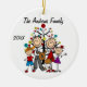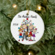 Eine hübsche runde Keramikandenken Weihnachtsfeiertagsverzierung kennzeichnet einen Strichmännchenvati, Mamma, Jungen in der Baseballmütze, Mädchen im lila Kleid und den Familienhund vor dem verzierten Weihnachtsbaum und den Bereichen, in denen Sie Text einschließlich das laufende Jahr und den Familiennamen hinzufügen können. Dieses ist ein entzückendes Geschenk, damit jede mögliche Familie das Jahr gedenkt!