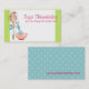 Hölzernes Löffelmädchen der super niedlichen retro Art, das eine Schürze, einen mischenden Teig mit einem Eischläger im retro Blau, ein Neonrot und Lose Polkapunkte trägt! Spaßgeschäftskarte für Köche, Köche, persönliche Köche, Lebensmittellieferant oder Catering, kochende Klassen, Lektionen, feinschmeckerisches Geschäft, Küchenspeicher oder andere Nahrung, Kochen oder kulinarischer Service kochend. Macht auch einen ordentlichen "von meiner Küche" Geschenkumbau für Ihre selbst gemachten Nahrungsmittelgeschenke oder kleines MarktVerpacken der Lebensmittel. Sie können die Hintergrundfarbe ändern, die die Seitenfarbe mit Tupfen ändert.