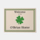 Die kundenspezifische irische Familien-willkommene Matte mit einer Kleeblatttürmatte kennzeichnet ein Bild des berühmten und gut anerkannten vierblättriges Kleeblatt Kleeblatts in der Mitte der Matte. Der Gruß "Willkommen zu" wird nahe der Spitze der Matte gedruckt und der Familienname wird nahe der Unterseite der Matte über dem Familiennamen wird gedruckt im mutigen und eleganten Schreiben unterhalb des Bildes des Kleeblatts gedruckt. Die Hintergrundfarbe der Türmatte ist ein warmer beige Schatten und das Bild auf der Matte ist mit zwei schwarzen Rechtecken gerahmt.