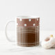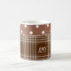Kundengerechte Kaffeetasse. Weißes Steingut mit den Kakao-braunen und weißen Polkapunkten gegeneinander gehalten mit Mokka-braunem kariertem. Fertigen Sie Ihren Namen oder Initialen im Quadrat besonders an. Wählen Sie sogar einen anderen Schriftart!