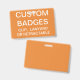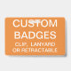 Gewohnheit druckte personalisiertes 3,38" x 2,13" ABZEICHEN leere Schablone (mit ORANGE Hintergrund - ändern Sie zu jeder möglicher Farbe). Entwurf, schaffen, machen Ihre Selbst. Ihr Foto, Bild, Text, Logo, Grafiken im farbenreichen Rand-zurand drucken auf der horizontalen Front und der Rückseite - oder den Vertikaleentwürfen. Gemacht von PVC-Plastik, verblaßt langlebiges Gut, nicht oder zerreißt. Verfügbar mit nur Abzugsleine, Metallclip, einziehbarem Klipp oder Abzeichen.