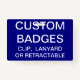 Gewohnheit druckte personalisiertes 3,38" x 2,13" ABZEICHEN leere Schablone (mit MARINE-BLAU Hintergrund - ändern Sie zu jeder möglicher Farbe). Entwurf, schaffen, machen Ihre Selbst. Ihr Foto, Bild, Text, Logo, Grafiken im farbenreichen Rand-zurand drucken auf der horizontalen Front und der Rückseite - oder den Vertikaleentwürfen. Gemacht von PVC-Plastik, verblaßt langlebiges Gut, nicht oder zerreißt. Verfügbar mit nur Abzugsleine, Metallclip, einziehbarem Klipp oder Abzeichen.