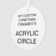 Gewohnheit druckte personalisierter KREIS-RUNDE ACRYLWEIHNACHTSBAUM-VERZIERUNGS-DEKORATION Raum-Schablone - 3,46" hoch x 3,14" weit x 0,187" dick. Entwurf, schaffen, machen Ihre Selbst. Ihr Foto, Bild, Text, Logo, Grafiken im farbenreichen Druck auf beiden Seite der Verzierung, unter Verwendung des AcryliPrint®HD Druckprozesses. Gemacht vom ultra-dauerhaften Acryl.