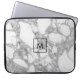 Kundenspezifische weiße Marmorsteinmonogrammlaptophülse. Eleganter Entwurf mit personalisiertem Namensanfangsbuchstaben. Schicke Geburtstagsgeschenkidee für Freunde und Familie. Übertragbarer Druck zu anderen Produkten auf Zazzle. Luzury Computerzubehör für ihn.