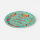 Ein hübscher Blumenwreath mit Blumen der Orange, des Goldes, des hellen Blaus, des Rosas, des Rotes, des Gelbs und der Brauneinfassungen der äußere Rand des PapierTellers des ersten Geburtstages, der für die erste Geburtstagsfeier perfekt sind! Brown-Text, der mit Orange umrandet wird, liest ersten Geburtstag, und Sie können besonders anfertigen, indem Sie den Namen Ihr Kindes und Geburtsdatum addieren! Ändern Sie den blauen Hintergrund des Aqua zu jeder möglicher Farbe, die Sie bevorzugen!