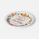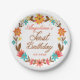 Ein hübscher Blumenwreath mit Blumen der Orange, des Goldes, des hellen Blaus, des Rosas, des Rotes, des Gelbs und der Brauneinfassungen der äußere Rand des PapierTellers des ersten Geburtstages, der für die erste Geburtstagsfeier perfekt sind! Brown-Text, der mit Orange umrandet wird, liest ersten Geburtstag, und Sie können besonders anfertigen, indem Sie den Namen Ihr Kindes und Geburtsdatum addieren!