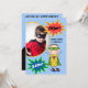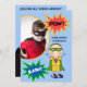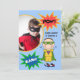 Ein Superheld des brünetten behaarten Jungen in einem grünen Kap und Maske auf Kindsuperheld-brünetten Jungen-Geburtstagseinladungen, die einfach, mit Foto- und Geburtstags-Partybesonderen Ihr Kindes besonders anzufertigen sind! Wenn es ein Superheld-Themageburtstag ist, den er hat, wird er Liebe das Aussenden dieses bunter Geburtstag einlädt!