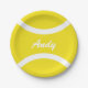 Kundenspezifischer gelber Tennisball GRILLEN-Party-Papier-Teller. Niedlicher Sportentwurf mit personalisiertem Namen. Spaßdruck für Kindergeburtstag-Party. Schaffen Sie Ihre Selbst mit Namen des Kindes oder der Kinder. Neutrale Grafiken für Jungen- und Mädchentennisspieler, Trainer und Fans.