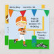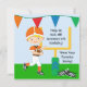Werden Sie zum Spieltag fertig! Diese bunten kundengebundenen Fußballthema-Geburtstagseinladungen sind für Jungen groß, denen Liebefußball oder eine Fußballgeburtstags-Partyfeier haben! Eigenschaftsflaggen, Fußballplatz, Fußball, Fußballschuhe und ein Junge in einem orange Football-Helm und in einem Jersey, die einen Fußball halten! Einfach, mit Geburtstags-Partybesonderen Ihr Kindes besonders anzufertigen!