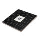 Ein weißes Tupfenmuster ist auf einem schwarzen Hintergrund. Schwarzes Monogramm ist auf einem weißen Quadrat in der Mitte. Das Quadrat hat eine Ordnung des Imitats (keine Folie) Gold.