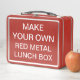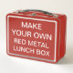Gewohnheit druckte personalisierte ROTE METALLmittagessen-KASTEN Raum-Schablone - 6,75" hoch x 8,625" weit x 3,75" tief, Gewicht: 12 Unze. Entwurf, schaffen, machen Ihre Selbst. Ihr Foto, Bild, Text, Logo, Grafiken im farbenreichen Druck auf einer Seite oder auf beiden Seiten vom Lunchbox. Nahrungsmittelkontaktsicheres Innenmaterial, langlebiges Gut - CPSIA Beanstandung - Weißblech, mit zusammenklappbarem schwarzem Plastikgriff. Wählen Sie von 6 niedrigen Farben: Weiß, rostfrei, schwarz, dunkelblau, hellblau u. rot.