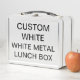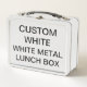 Gewohnheit druckte personalisierte WEISSES METALLmittagessen-KASTEN Raum-Schablone - 6,75" hoch x 8,625" weit x 3,75" tief, Gewicht: 12 Unze. Entwurf, schaffen, machen Ihre Selbst. Ihr Foto, Bild, Text, Logo, Grafiken im farbenreichen Druck auf einer Seite oder auf beiden Seiten vom Lunchbox. Nahrungsmittelkontaktsicheres Innenmaterial, langlebiges Gut - CPSIA Beanstandung - Weißblech, mit zusammenklappbarem schwarzem Plastikgriff. Wählen Sie von 6 niedrigen Farben: Weiß, rostfrei, schwarz, dunkelblau, hellblau u. rot.