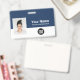 Dieses Abzeichen mit dem Namen des Mitarbeiters kann einfach mit Foto, Bar-Scan und Firmenlogo personalisiert werden. Ein einfaches Business-Design in marineblau-weißer Farbe, das in Vorder- und Rückengrößen vollständig anpassbar ist, serifenlose, einfache und moderne Schriftart und ein berufliches und klares Aussehen. Verfügbar mit oder ohne Lanyard, Metallklammer oder mit Retraktierbar. Keine Mindestbestellung.