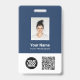 Personalisieren Sie dieses Abzeichen mit dem Namen Ihrer Mitarbeiter mit Foto, Scannen von QrCode und Bar Code und dem Firmenlogo. Ein einfaches Business-Design in marineblau-weißer Farbe, das in Vorder- und Rückengrößen vollständig anpassbar ist, serifenlose, einfache und moderne Schriftart und ein berufliches und klares Aussehen. Erhältlich mit Lanyard, Metallklammer oder mit Retraktikett. Keine Mindestbestellung.
