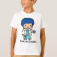 Niedlicher Junge im weißen Mantel eines Arztes mit Stethoskop und Reflexhammer. Für den zukünftigen Arzt. Anpassen des Texts