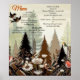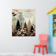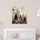 Eine wunderschöne Fantasy Art Illustration in einem modernen Stil zeigt eine Vogelfamilie unter verschiedenen großen, hellen, mittleren und dunkelgrünen Pinienbäumen mit cremigem Hintergrund und Blume.