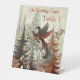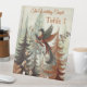 Eine wunderschöne Fantasy Art Illustration in einem modernen Stil zeigt eine Vogelfamilie unter verschiedenen großen, hellen, mittleren und dunkelgrünen Pinienbäumen mit cremigem Hintergrund und Blume.