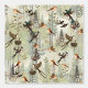 Eine wunderschöne Fantasy Art Illustration in einem modernen Stil zeigt eine Vogelfamilie unter verschiedenen großen, hellen, mittleren und dunkelgrünen Pinienbäumen mit cremigem Hintergrund und Blume.