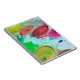 Farbenfrohe Farbspritzen in diesem Foto einer Aquarellmalpalette von Künstlern. Niedliche und farbenfrohe runde Kuchen mit lebendiger und lebendiger Farbe füllen diese Palette. Verschüttete und Spritzer geben ihm ein gut gebrauchtes künstlerisches Aussehen.