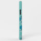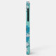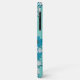 Ein Gehäuse mit Blumenmuster auf hellblauem Hintergrund. Das Muster besteht aus blauen und weißen Blume mit dunklen Zentren, grünen Blätter und kleinen rosa Beeren. Die Blume sind dicht, überlappend angeordnet und schaffen ein reichhaltiges und strukturiertes Design. Das Gehäuse ist glänzend, die Kameraobjektive sind in der oberen links Ecke sichtbar. Der Gesamtstil ist feminin und dekorativ, wobei der Schwerpunkt auf natürlichen Elementen liegt. Die Farbpalette ist weich und beruhigend, mit einer Mischung aus coolen und warmen Farbtönen.
