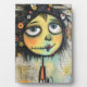 Ein skurriler Charakter mit übertriebenen Großaugen und einem gesteppten Mund ist der Brennpunkt vor einem Hintergrund voller skriptähnlicher Texte und abstrakter Elemente. Das Haar des Charakters ist mit verschiedenen bunten Formen und Gegenständen geschmückt und verleiht dem Stück ein spielerisches und exzentrisches Ambiente.