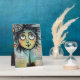 Ein skurriler Charakter mit großen, ausdrucksstarken Augen und einem farbenprächtigen, gefederten Headpiece dominiert den Vordergrund vor einer Collage von geschriebenen Texten und abstrakten Elementen im Hintergrund. Die Figur zeichnet sich durch einen sonderbaren Charme mit unverhältnismäßigen Merkmalen und hellen Akzenten-Farben aus.