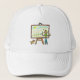 Künstlerisches Maldesign zeigt einen Kunstliebhaber, der Wasserfarben oder Öle verwendet, um eine große Leinwand zu malen, die auf einer Kunsthalle stehend ist. Der Künstler hält in der einen Hand einen Pinsel und in der anderen eine Palette. Spaß Grafik für Kunstliebhaber.