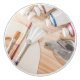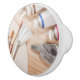 Keramik-Drehknopf mit einem Bild von verschiedenen Kunststoffen, einschließlich Bürsten, Skalpellen, Esel und einige Röhren von Ölfarbe.