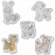 Vintage Aufkleber für Spielzeug aus Kunststoff. Hase, Kätzchen, Lamm, Welpe und Tiger.