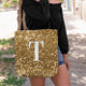 Ein modernes, fett gedrucktes Single-Monogramm in Weiß mit einem schwarzen Schlagschatten. Die Größe, die Farbe und der Stil des Schriftartes sind individuell einstellbar. Der Hintergrund ist ein Imitat Kupfer Gold Glitzer mit funkelnd Flecken oder Buch. Verschieben oder löschen Sie die kleinen Imitate funkeln grafische Bilder. Goldenes Kupfergeschenk für eine Brautjungfrau oder ein anderes Mitglied Ihrer Hochzeitsfeier.