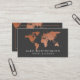 Hoch entwickelte kupferne Weltkarte auf dunkelgrauem Hintergrund ist eine minimale und moderne Geschäftskarte für einen Reise-Agenten, ein Reise Blogger, ein Ferien-Zuhauseinhaber- oder Hochzeit in Urlaubsortsplaner oder internationaler weltweiter ein Verkaufsangestellter. Schriftart und Kartenhintergrundfarbe können geändert werden, um Ihre einbrennenden Farben des Kleinbetriebunternehmers zusammenzubringen. Folie ist ein Druckeffekt, nicht authentische Folie.