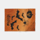Halloween-Design mit schwarzem bösen Kürbis, Fledermäusen und Spinne über einem orangefarbenen Hintergrund