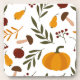 Ein volkstümliches inspiriertes Muster von zweifarbigen Kürbissen, Granatäpfeln, Birnen, Pilzen, Blätter und roten Beeren.