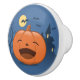 Adorable lachende Halloweenkürbis. Ein toter Baum, ein graues Herrenhaus, ein paar Fledermäuse und der Mond sind im Hintergrund zu sehen.