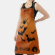 Halloween-Design mit schwarzem bösen Kürbis, Fledermäusen und Spinne über einem orangefarbenen Hintergrund