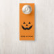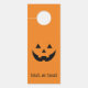 Trick oder behandeln Orange und Schwarz Kürbislaterne lustig lustige niedliche Halloween Door Hanger Schild. Halloween Dekorationen. Anpassbare Schwarz- und Kürbislaterne-Oberfläche auf solidem orangefarbenem Hintergrund. Karo der Erholung der Kollektion für die Koordination und Abstimmung von Gegenständen und zusätzlichen Halloween-Party-Vorräten und Dekorationen
