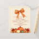 Ein zarter, beige Hintergrund. Kürbis, orange und gelbe Blumen und ein großer Bogen. Personalisieren Sie die Party-Details und fügen Sie sie hinzu. 1 Blatt = 1 Einladung mit Druckkante bis Kante.